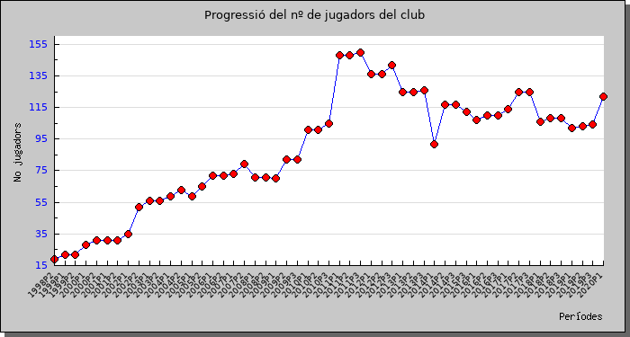 En primer lloc una gràfica que indica la progressió que duu el club pel que fa a nº de jugadors, una progressió que a dia d'avui (octubre 2019) ens segueix mantenint per sobre del centenar de llicències, que ens situa com uns dels clubs catalans amb més jugadors i jugadores.