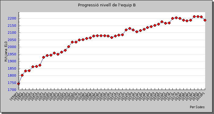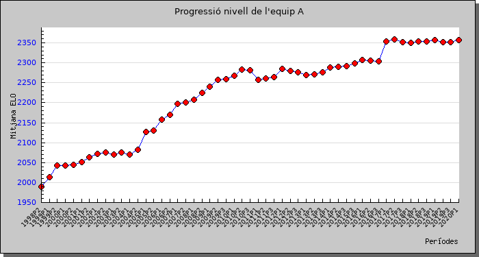 A continuació uns gràfics que mostren l'increment de nivell del club. Per representar aquest fet hem agafat la mitjana d'elo dels teòrics equips A i B de cada semestre (o sigui, suposant que els 10 primers jugadors de la llista formen l'equip A i els 10 següents formen l'equip B). Es pot apreciar clarament l'impuls que va suposar pel primer equip (i en menor mesura per la resta d'equips) l'arribada dels jugadors del ADAC (1r semestre de 2005) i també les incorporacions de l'Àlvar Alonso i l'Àlex Vidal (gener 2017).